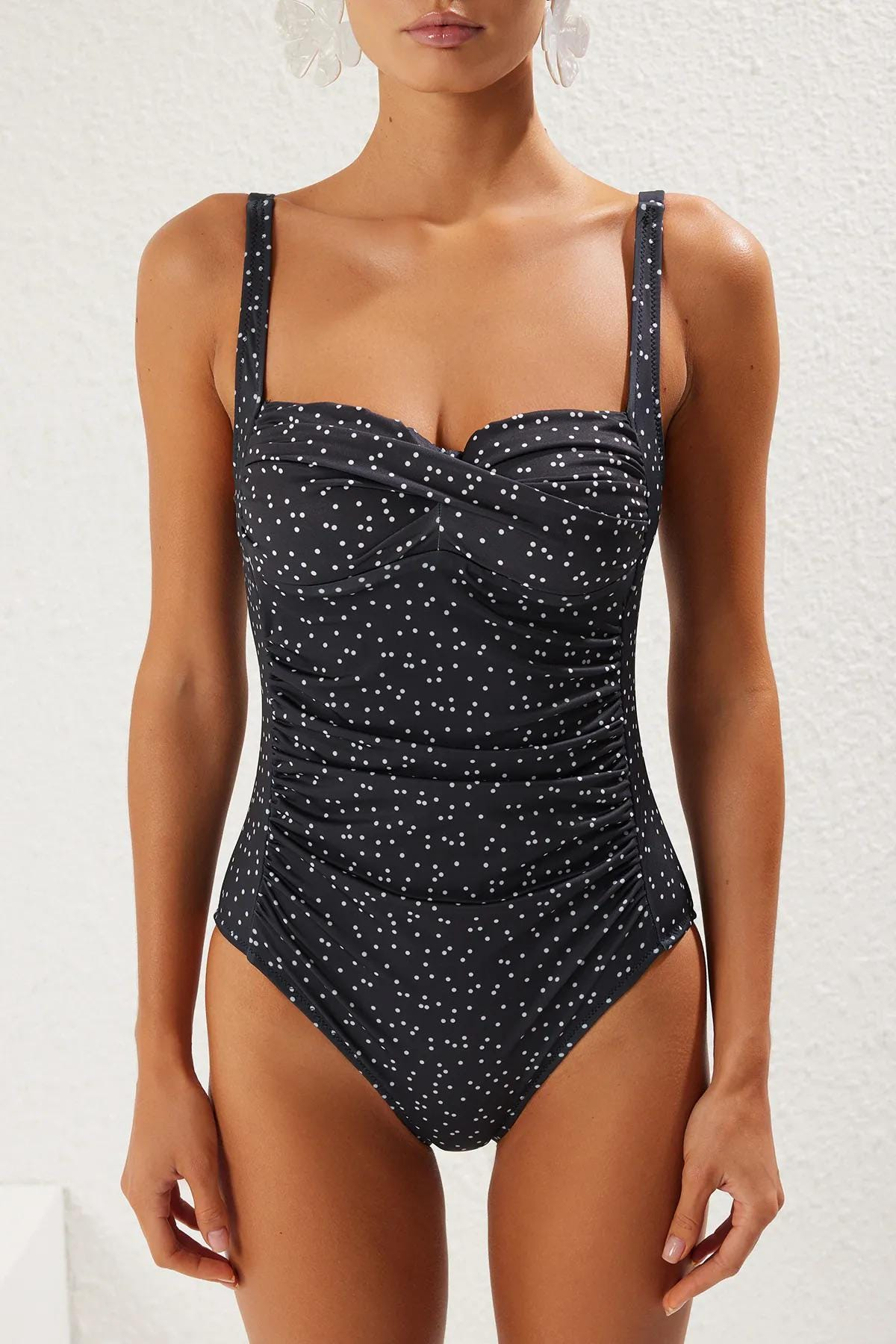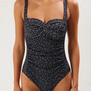 Add a playful yet refined touch to your vacation wardrobe with this black star print one piece swimsuit. Designed with a flattering sweetheart neckline and softly ruched bodice, it enhances your natural curves while maintaining a comfortable and secure fit.