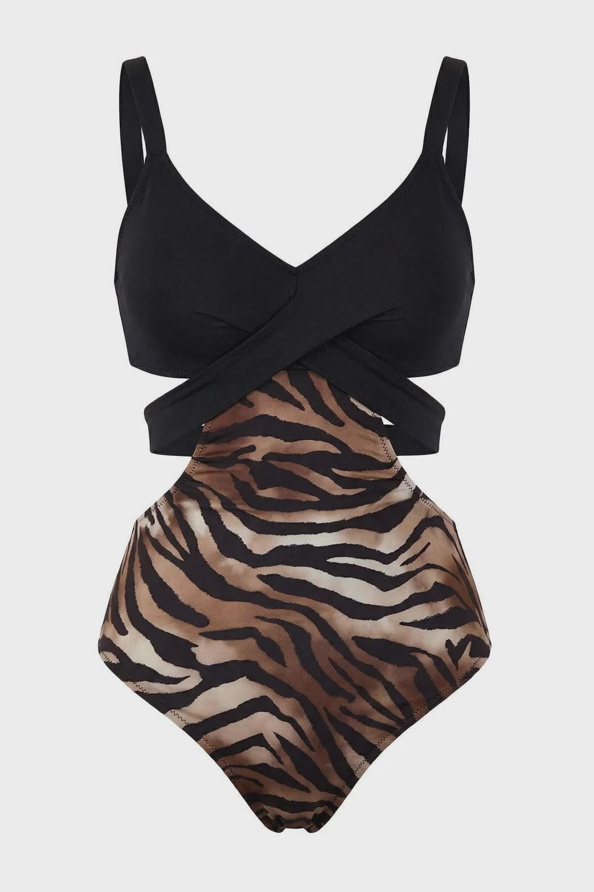 Bold and fashion forward, this one piece swimsuit combines sleek black with a striking tiger print for a standout resort look. Designed with a wrap style top and a sculpted cut out waist, it creates a flattering hourglass silhouette while adding a modern edge.