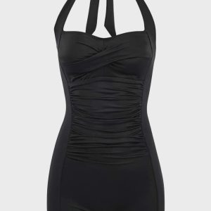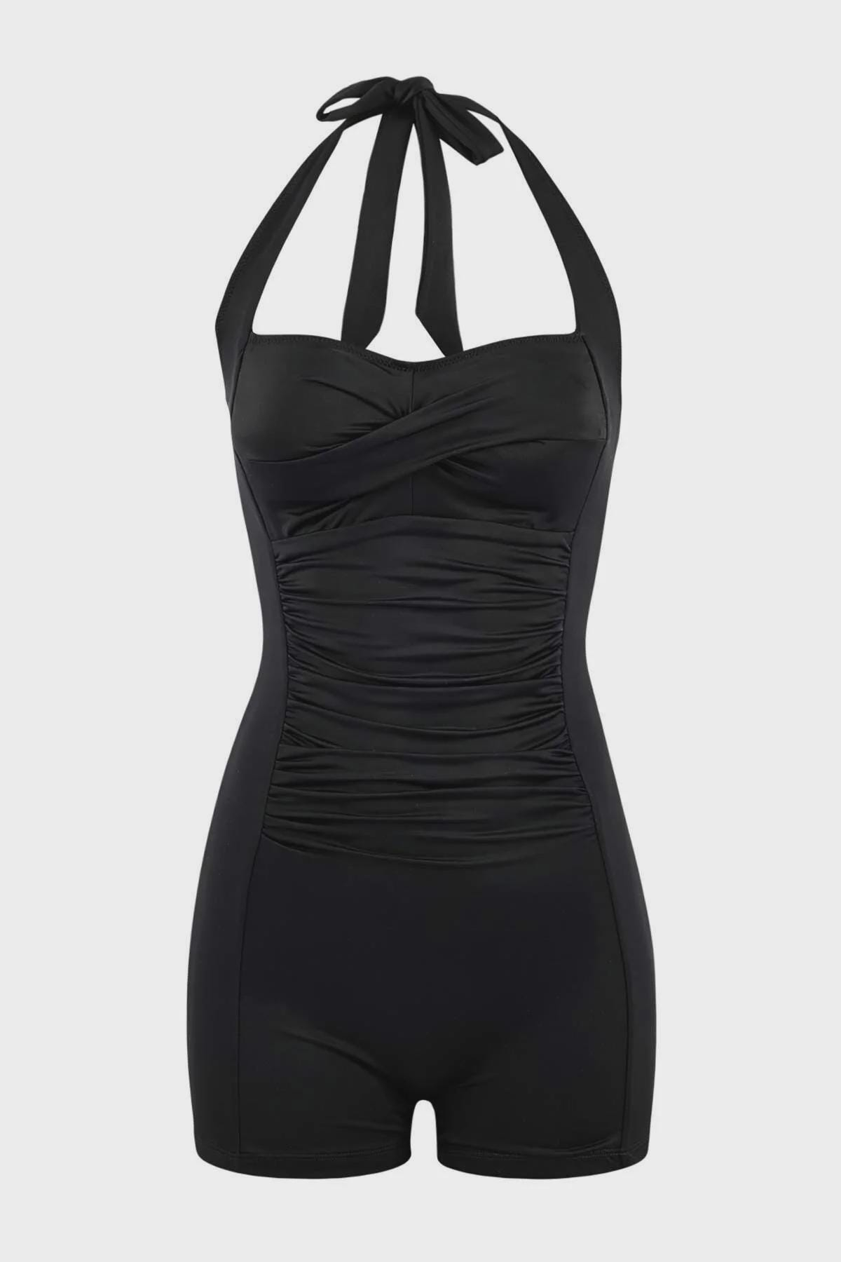 Timeless and effortlessly refined, this black one piece swimsuit is designed to bring a graceful resort feel to your swimwear collection. Featuring a flattering halter neckline and a softly ruched bodice, it enhances your natural silhouette while offering a smooth, sculpted fit.